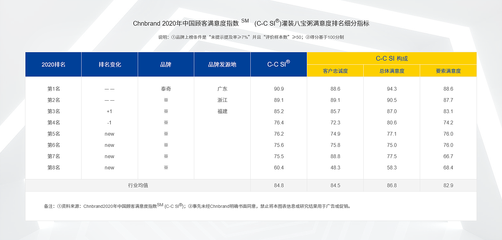 ? ? ? Chnbrand 品牌評級權威機構 發布的2020年(第六屆)中國顧客滿意度指數SM(C-CSI)品牌排名和分析報告,報告當中,泰奇食品(灌裝八寶粥),以中國顧客滿意度指數C-CSI 90.9? ,榮獲排行第一。